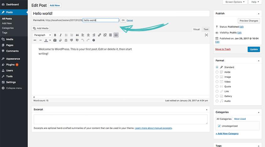 If your URL looks something like: www.domena.si/?p=123 then is time to edit it. This is not the best way for visitors or Google.