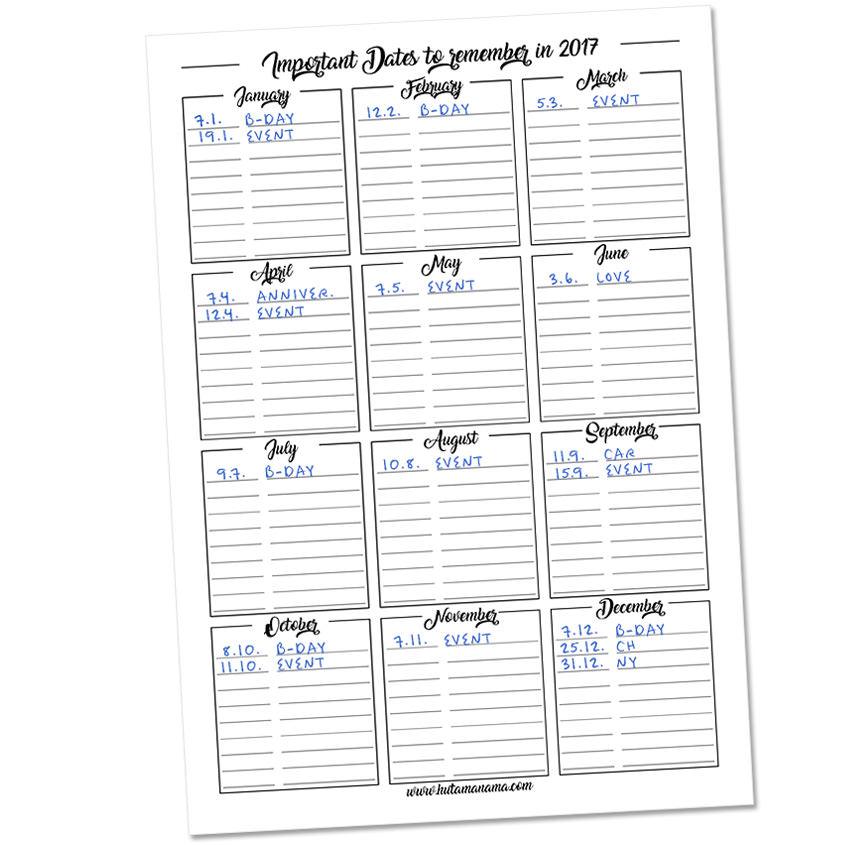 Did you forget someone’s birthday? Or time past so fast and you forget to register your car, go to an event you really want to go or even forget anniversary? We all do, sometimes. 🙂 But now you can keep all your important dates on one page! You can download, print, fill up this printable and then insert it into your planner, or even attach it to the refrigerator. Every start of the month looks to your list to remember important dates in this month. Nice, right? You’re Welcome! 😉