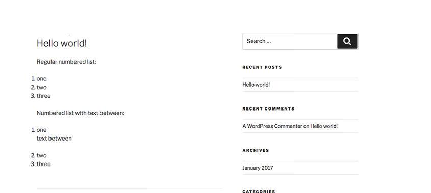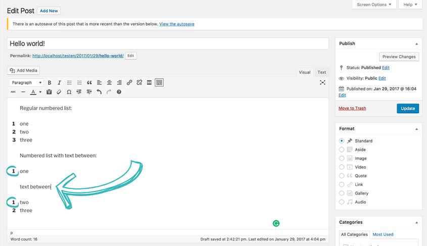 Numbered lists can be a pain in the ass if you would like to add text between.