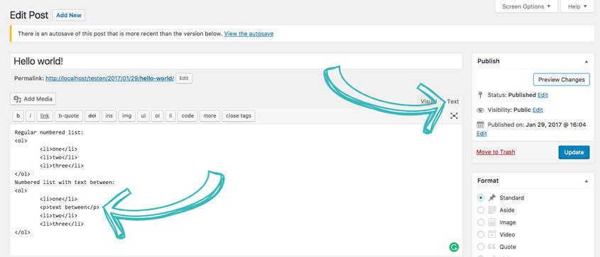Click on “Text” and edit so that all <li></li> will be inside <ol></ol>: