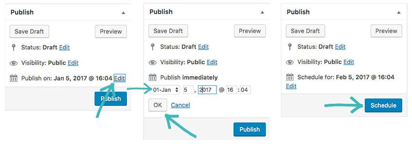 In Publish part click Edit > choose time and date > click OK > and click Schedule: